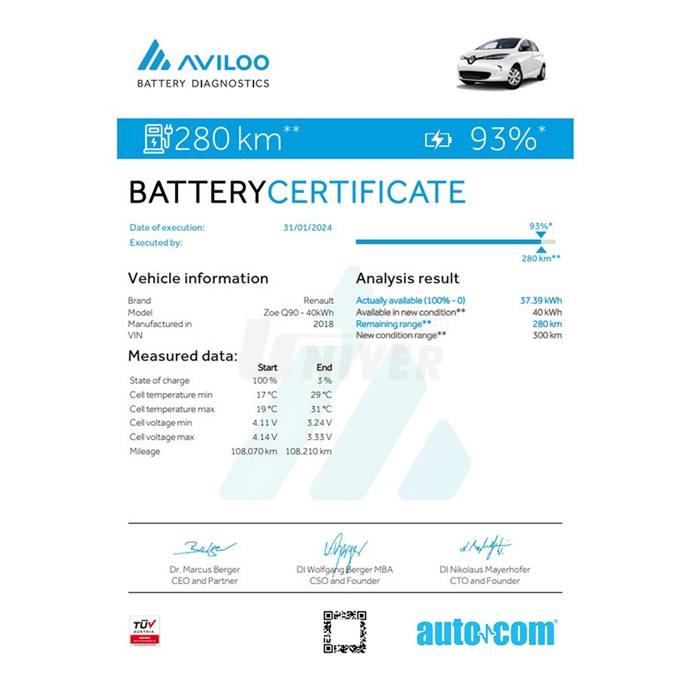 7. Na e-mailu testujícího se během 2 pracovních dnů objeví testovací certifikát (Autocom AVILOO BATTERY CERTIFICATE).