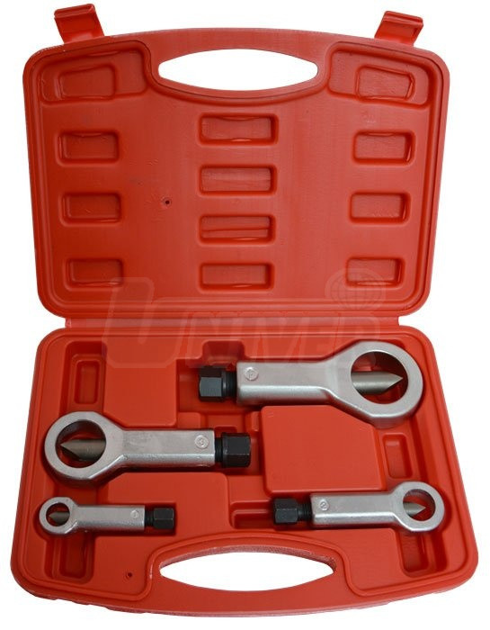 Sada (4-dílná) jednobřitových trháků matic 9 – 27 mm.- nepovolitelné, přetočené nebo jinak poškozené matice lze roztrhnout bez poškození závitu šroubu