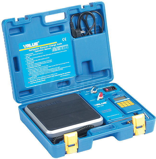 Elektronická váha na chladivo klimatizace s ovládacím elektromagnetickým ventilem pro odsávání a doplňování chladiva v odolném plastovém kufříku.- ovládání elektromagnetickým ventilem pro přesné doplňování a odsávání chladiva