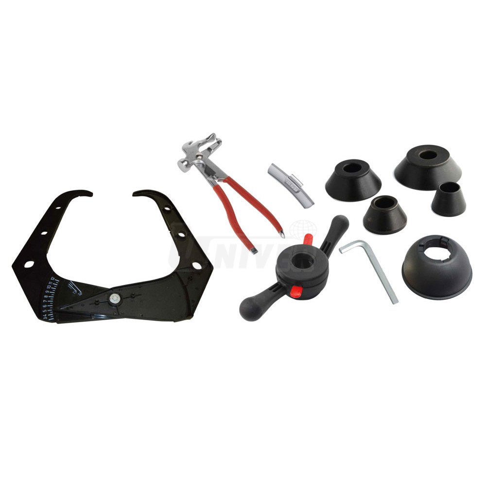 standardní vybavení: středová příruba, 4 středicí kužely, obkročné měřidlo šířky ráfku, kleště na vyvažovací závaží, kalibrační závaží, klíč
