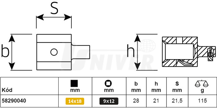 Adaptér pro zástrčné elementy/nářadí s vnějším čtyřhranem 9 x 12 mm v momentových klíčích s vnitřním čtyřhranem 14 x 18 mm. Zajišťovací systém QuickRelease zaručuje bezpečné fixování a rychlou výměnu zástrčných elementů.