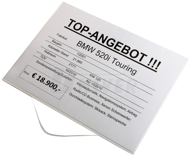 zástrčný průhledný polykarbonátový držák formátu A3 na šířku vysoké kvality se používá zejména pro prezentaci technických údajů a cen nových i ojetých automobilů v showroomech i v autobazarech
